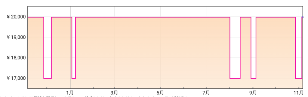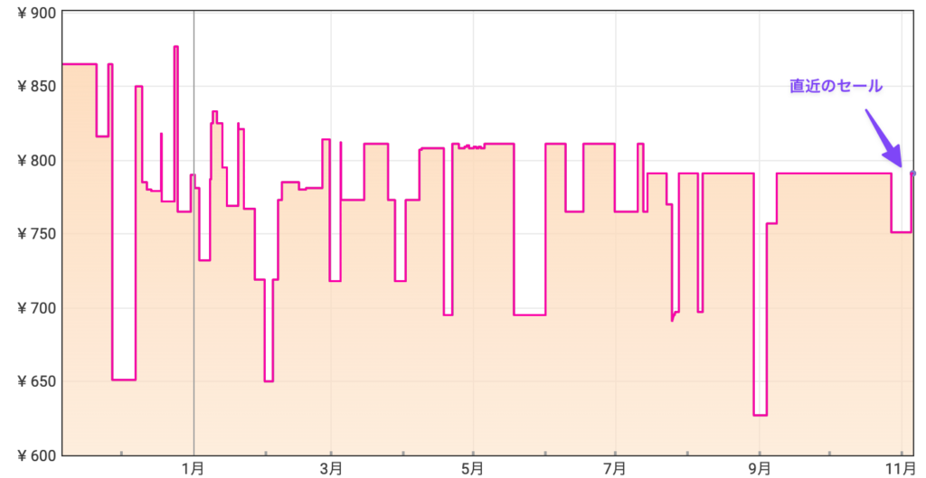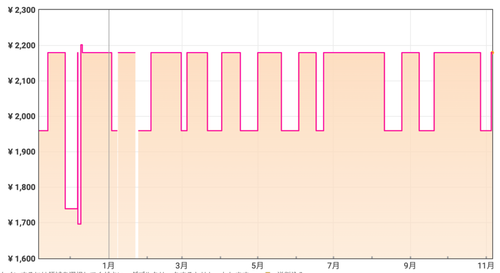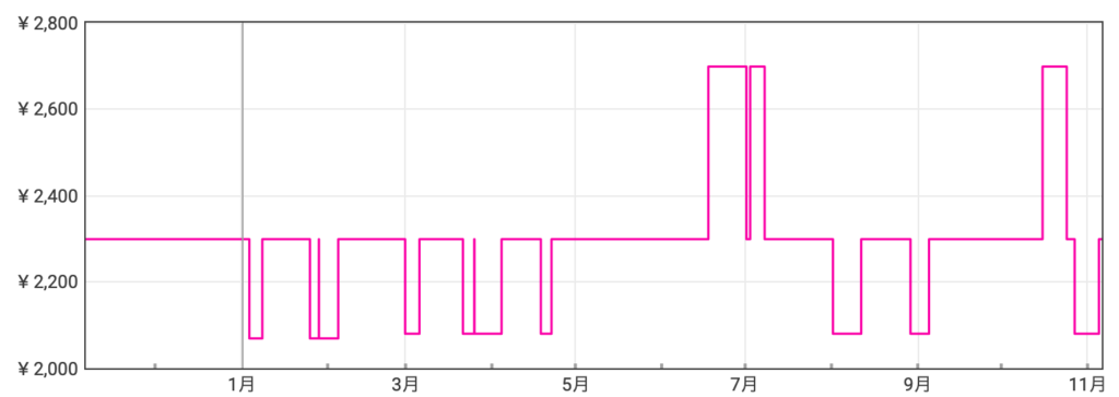 定番商品なので基本同じ価格を行ったり来たりしているが、年末(12月)のセールは気合が入った値下げがおこなわれている。